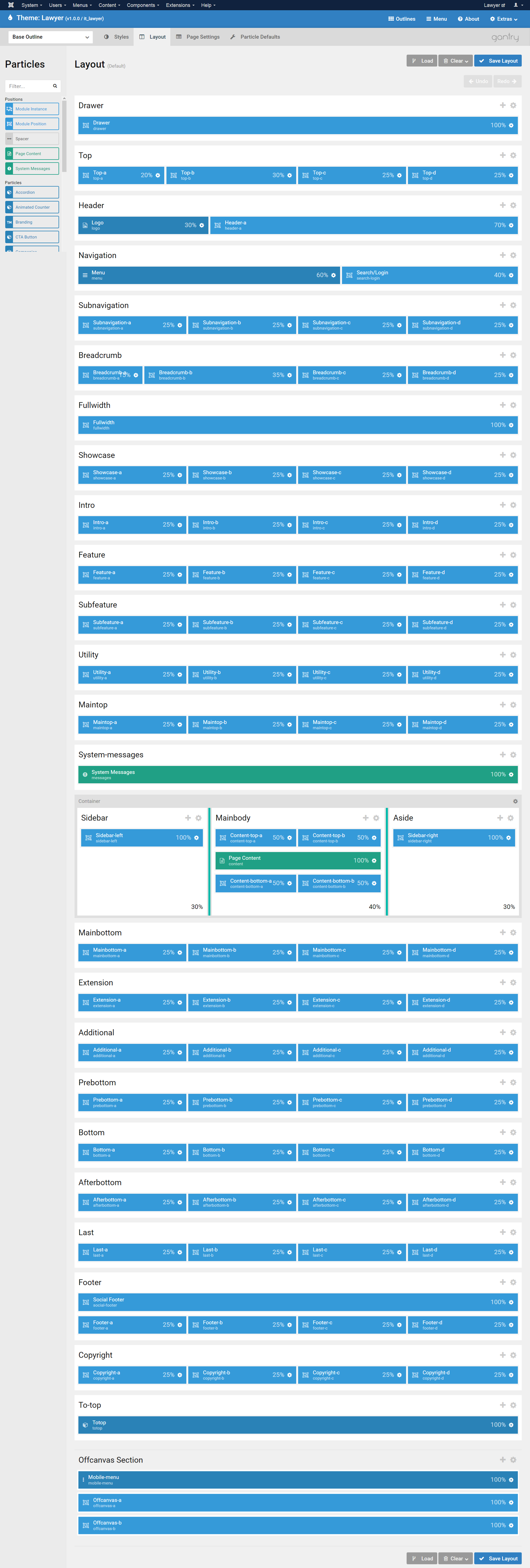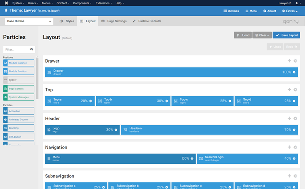 Gantry 5's layout manager benefits from a drag and drop interface, providing an easy mechanism for adding, removing, configuring, moving and re-sizing positions and particles.